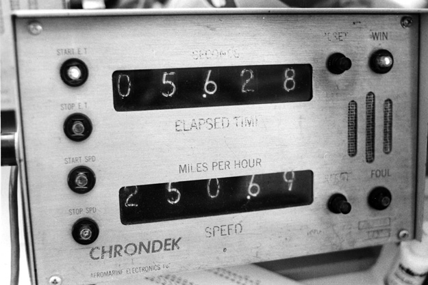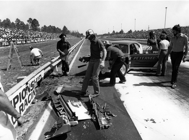 Larry Peternel was excited to have qualified his Chrysler Imperial in the Pro Stock field but didn't get past the first round after the car smashed into the guardrail while attempting a burnout. His opponent, “Dyno Don” Nicholson, got a bye run.