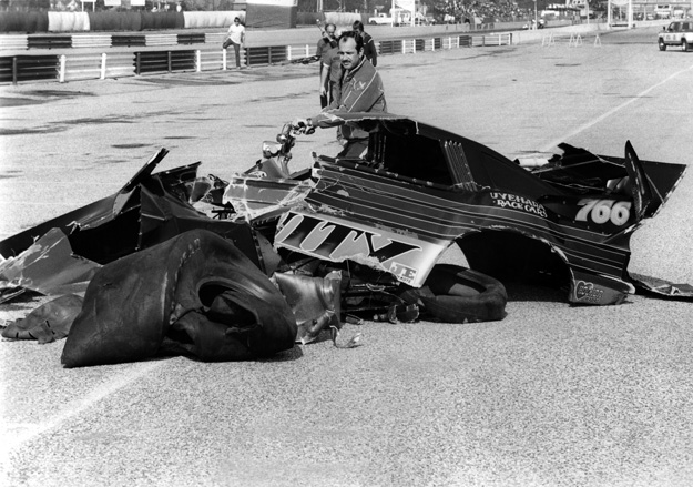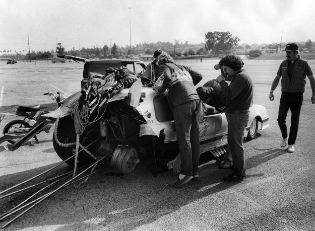 These two photos showed the aftermath of a nasty collision involving Dave Uyehara and Ron Correnti during Saturday’s first session of Funny Car qualifying. Uyehara’s Insanity Dodge Charger veered left after exploding the blower and crossed the centerline, slamming right into the back of Correnti in Bill Dunlap’s CCR Racing Thunderbird. The bodies of both cars were shredded as they locked together, finally separating 300 feet downcourse. Uyehara’s loss of control was later attributed to broken steering. Both drivers walked away from the incident unharmed.