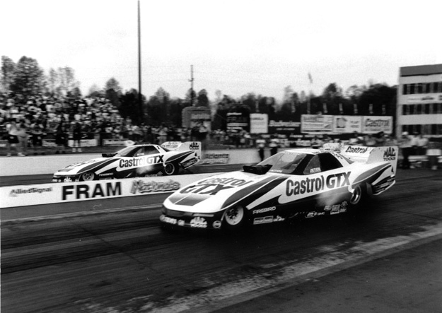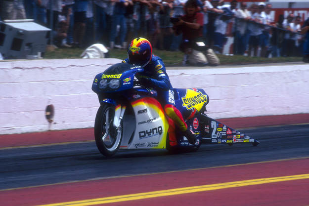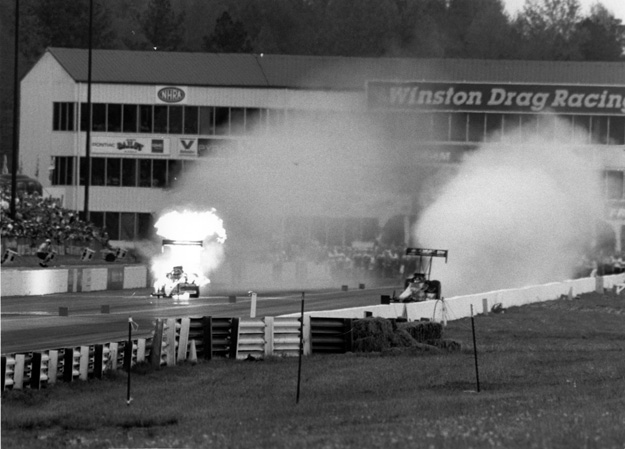 Larry Dixon earned his first victory of the year by outlasting Mike Dunn in an eventful Top Fuel final. Dixon, near lane, suffered two flat front tires after setting the car down following a starting-line wheelie while Dunn’s engine exploded. Dixon got back on the throttle to pass Dunn, who also got back on the throttle despite the fire, but Dixon passed Dunn at about the 1,000-foot mark to win.