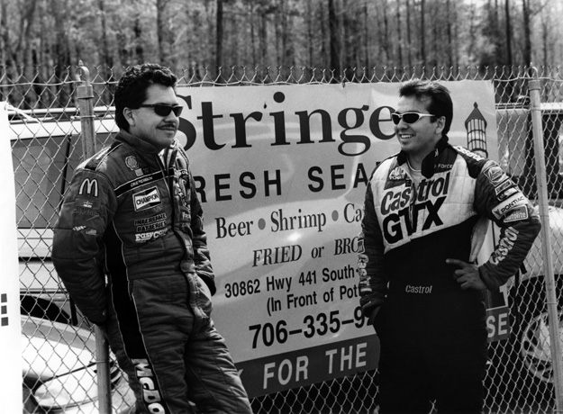 Brothers Cruz, left, and Tony Pedregon chatted as they prepared for race day. No. 2 qualifier Cruz exited early when he fell to Jeff Arend in the first round. (Below) Tony had a better day and defeated boss John Force to collect his first NHRA Funny Car title.