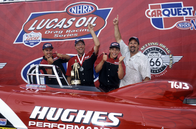 Kevin Kleineweber celebrated in the winner’s circle at Route 66 Raceway after he drove his ’01 Corvette to a 9.89 to 9.88 double-breakout victory over Larry Bernshausen’s ’77 Vega in the final round of Super Gas.