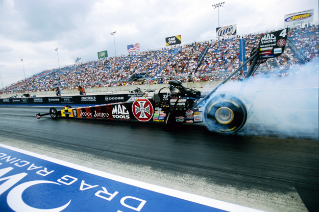 Scott Kalitta drove his Mac Tools/Jesse James Top Fuel dragster to the winner’s circle in Chicago for his second win of the 2005 season. Kalitta was late coming off the line but drove around Rod Fuller to turn on the win light in the Top Fuel final round.