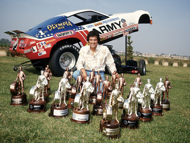 People thought that “the Snake” was incredible in 1975 when he drove his Army Monza to an incredible six wins in eight events en route to his first Funny Car championship in 1975, but no one was ready when he one-upped that in 1976 with seven wins in eight starts. Ironically, the only blemish on Prudhomme’s perfect national event record was a final-round loss at the year’s biggest event, where he fell in the final round to Gary Burgin. Prudhomme set low e.t. at all eight events, qualified No. 1 seven of eight times – Burgin is the one who stopped him from perfection there as well – had top speed of the meet six times, and reset the national record twice. He also won three divisional events, which at the time were part of the points-scoring equation.