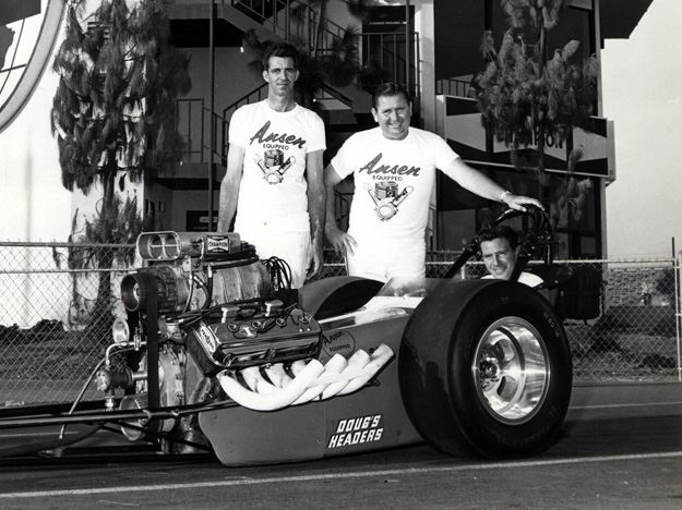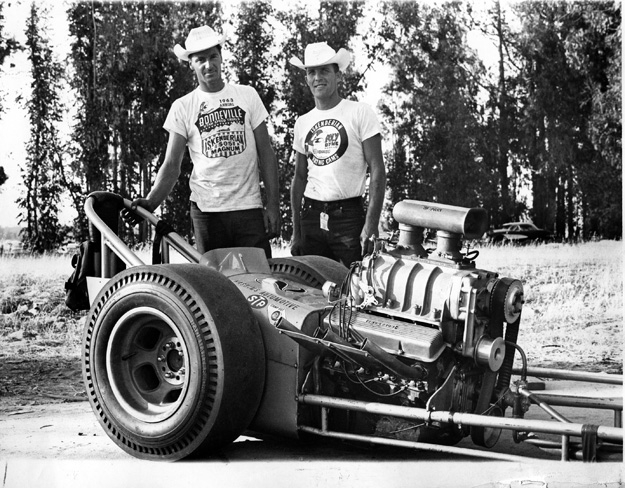 In late 1964, Warren, left, and partner Roger Coburn teamed with Chuck Holloway, right, on a 327 Chevy-powered fueler, known as the "Blue Car."