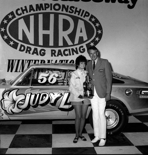 In 1968, Lilly switched to a Hemi Barracuda (above) and scored her first NHRA national event victory at the 1972 Winternationals. She became NHRA’s third female winner and the first in Super Stock. (Below) Lilly received the trophy from NHRA founder Wally Parks.