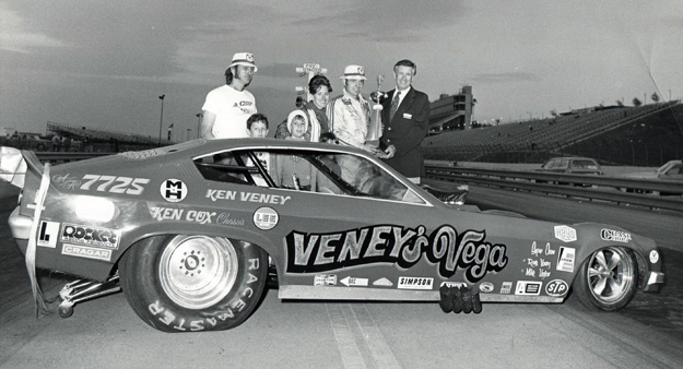 Veney designed and built the first of four Veney’s Vega Funny Cars in 1972 and went undefeated for the season. In 1973, he added nitro, and in one of his few NHRA appearances in A/FC Comp, he recorded a new national record with a 7.45. Veney was the No. 1 qualifier and runner-up at Pro Comp’s first race, at the 1973 Supernationals in Ontario, Calif. At the following event, the 1974 Winternationals, he made the first NHRA run in the sixes and was runner-up to Dale Armstrong, who was driving Veney’s A/Fuel Dragster. It wasn’t until the 1975 Summernationals in Englishtown that Veney won his first national event with the quickest run in history, a 6.76.