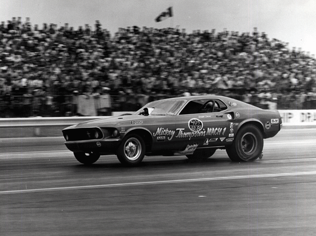 Thompson worked with Pat Foster to redesign the Funny Car chassis in 1968 to include such features as a dragster-style roll cage and narrower framerail dimensions. Thompson’s Danny Ongais-driven Mustang Mach 1 Funny Car dominated competition in 1969, and Ongais won the NHRA Springnationals and Nationals that year.