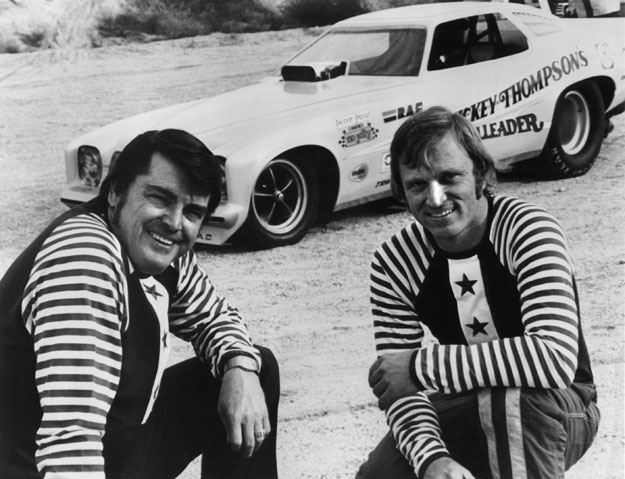 The last Funny Car with which Thompson was involved was the Revelleader Grand Am, which had a body that Thompson designed and commissioned. Thompson, left, with original 1973 driver Butch Maas, had several notable drivers in the car in the next couple of seasons, including Charlie Therwanger, Larry Arnold, Bob Pickett, and Dale Pulde, after Maas suffered burns in the car in a nasty fire in Gainesville. Pulde drove the car to a national record 6.16 at the 1974 World Finals.