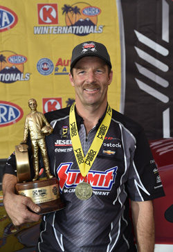 “I feel honored to be the first winner of the fuel-injection era and get the first trophy,” said Anderson. “I can’t tell you how proud I am of this Summit Racing team. It is getting better every run. That’s going to pay off down the road. Everybody out there is in a steep learning curve right now. The other competitors in our class are going home and working hard, and they will do better at Phoenix. We are going to have to buckle down and find something better again. Hopefully we will be better again come Phoenix.”