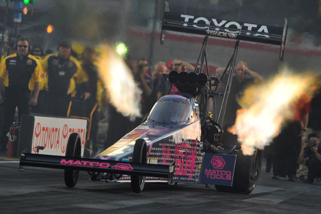 At the most recent NHRA event in Dallas, Millican recorded some of the best incremental runs ever seen in Top Fuel, but his Dave Grubnic-tuned dragster didn’t make it to the finish line under power. On Saturday night, Millican’s Parts Plus/Great Clips dragster did make it to the finish line under power, and the end result was a spectacular 3.689 that was not only a track record but also a career best.