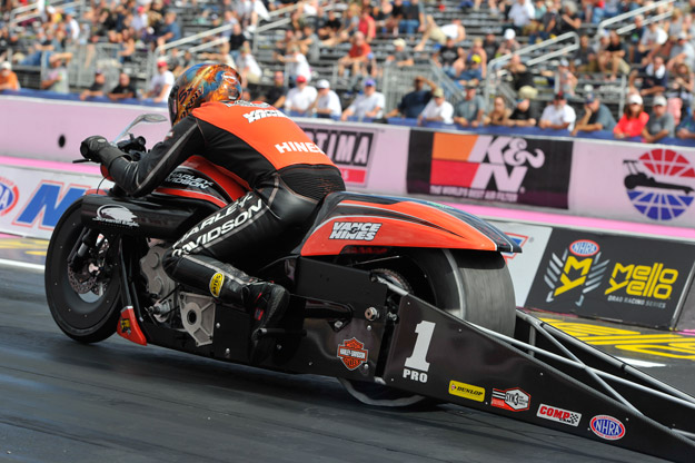 The Vance & Hines Screamin' Eagle Harley teammates race each other often, but their latest meeting in the semifinals was one of their most meaningful. Hines won the bout, 6.968 to 7.014, and as a result, the factory riders will head into the final event of the season tied for the lead in the points battle.