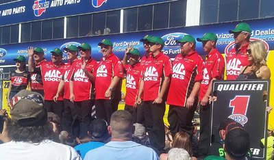 We didn't pick up any little gold men named Wally in Phoenix, but we had another pretty good weekend. J.R. struggled a bit on Sunday and went out in first round. Alexis made a great 3.96 pass in first round, but it wasn’t enough to turn on her win light. Del made it to second round before Robert Hight laid down a stout pass to send the DHL team packing. Doug's Mac Tools team was making some impressive runs all weekend! It was awesome to see my dad and all the Mac Tools guys come onto the stage in their No. 1 qualifier hats on Sunday morning for driver intros.