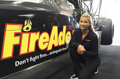 Pritchett began her partnership with FireAde 2000 when it signed on to be a multi-race sponsor of Pritchett’s BVR dragster for 2016. Although circumstances have changed, the manufacturer of innovative and environmentally friendly firefighting, tank-cleaning, and dust-control products has stepped up to support Pritchett for this unique NHRA event.
