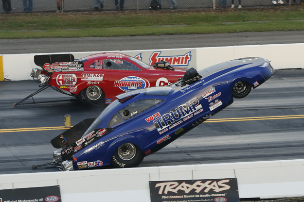 Top Alcohol Funny Car driver Clint Thompson got a view of the sky that he wasn’t expecting when his car broke a wheelie-bar assembly in the semifinals. Thompson wasn’t hurt but lost the round to eventual winner Andy Bohl.