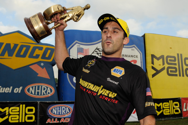 Winners: Vincent Nobile (pictured) made it known before the event that nothing less than a victory would help his cause as far as the world championship, and the Mountain View driver delivered, which makes him the event's biggest winner by far. Greg Anderson can also claim a win even though he lost to Nobile in the final because he made up ground on teammate Jason Line.