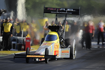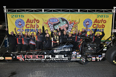Langdon reached the winner's circle in Pomona with two different teams when he won the season opener with Alan Johnson Racing (top) and ended the year winning for Don Schumacher Racing.