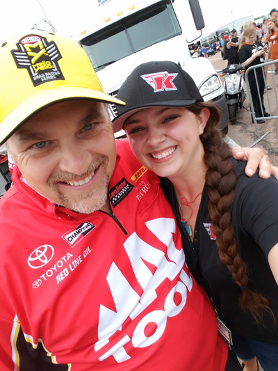 After the crazy qualifying sessions, Doug was No. 2, J.R. was No. 9, Alexis was No. 5, and Del was No. 6. Once again, J.R. got paired with Antron Brown for a tough first round opponent, and the reigning champ sent the SealMaster team packing. Alexis and Del were both victorious in first round, but their days ended in round two. As in Houston, the Mac Tools car was the last Team Kalitta entry standing (or rolling). Doug had won back-to-back races before, but he had never won three in a row. Would it finally happen here in Topeka, at Scott Kalitta’s favorite track? The answer is yes! In spectacular fashion, Doug piloted the Mac Tools dragster across the finish line after doing some crazy drifting to get the win over Antron in the final. It was pretty sweet to see how much coverage Doug got online after the slo-mo video of that run was released. That driving job backs my dad up when he says Doug is one of the best in the business!