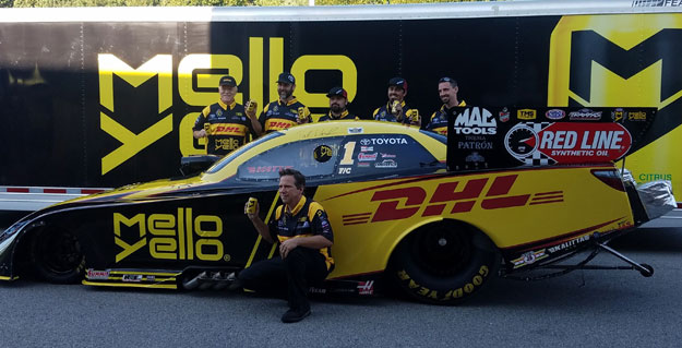 After a relaxing off weekend, it was time to get ready for the madness of Indy. The U.S. Nationals in Indianapolis is easily our biggest race of the year, and it’s also the longest since it’s a four day race instead of three. Also, we run the Traxxas Shootout on Saturday and Sunday, so it makes for a very busy weekend. We didn’t have much success with the Traxxas Shootout this year, but we did have both Doug and J.R. advance to the semifinals on Monday, Del made it all the way to the final round, and Alexis clinched her spot in the Countdown! Even though we weren’t able to bring home a Wally, it was still a successful weekend as a whole. I mean, having a car in the final round at Indy is a pretty big deal even if you don’t win, so that’s something to be proud of! Something else that made the weekend so special was running a special DHL/Mello Yello scheme on Del’s car. It was exciting to change up the look of the car, even if it was just for one race.