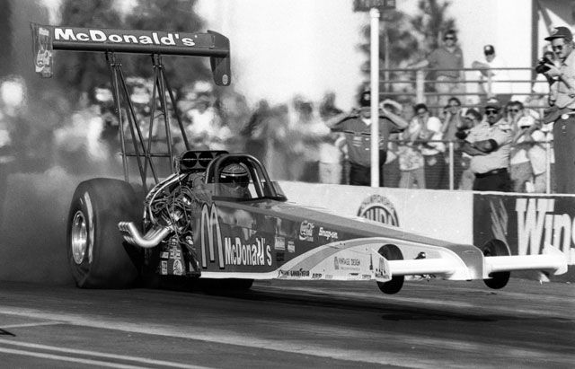 After making his Top Fuel debut at the 1992 season finale in Pomona, Pedregon continued to run in the category on a part-time basis the following two seasons. This photo of Pedregon behind the wheel of a McDonald’s-backed dragster was taken at the first race of the 1993 season.