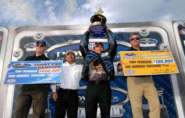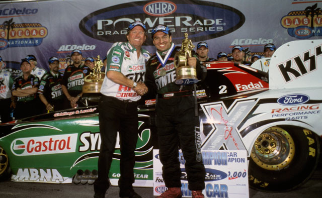 In addition to scoring 42 more times after that initial win in Atlanta, Pedregon also collected two Funny Car world championships. Pedregon earned his first in 2003 while still part of Force’s team (above), and he earned the second in 2007 driving for his own team (below).