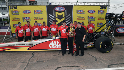 She won a close race against Tommy Johnson Jr. to get the light in the semi’s by a .007-second margin. She was considered an underdog in the final against Tim Wilkerson, who won Phoenix and Charlotte and recorded career-best numbers in order to qualify No. 1 for the first time in four years and 18th time in his career. The difference in the final was the between-rounds adjustment, namely Force’s crew anticipating the track getting better in cooling conditions and making their best run of the event at 3.913 seconds while Wilkerson slowed to a 3.943. The two drivers are now tied atop the points standings.