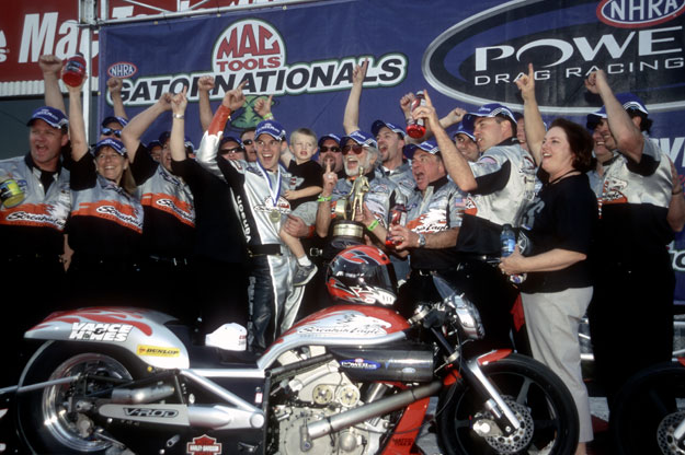 When Hines began his Pro Stock Motorcycle career in Denver in 2002, he was known as Matt’s brother, but the younger Hines has certainly stepped out of his championship-winning brother’s shadows and established himself as one of the class greats (and continues to build on that). Beginning at the 2004 Gainesville event, where he bested then-teammate GT Tonglet, Hines has racked up 43 victories, the most recent coming at this year’s four-wide event. A five-time world champion, Hines is within two wins of tying Schultz, and there is a high probability we could see him become the No. 1 ranked driver before this season ends.
