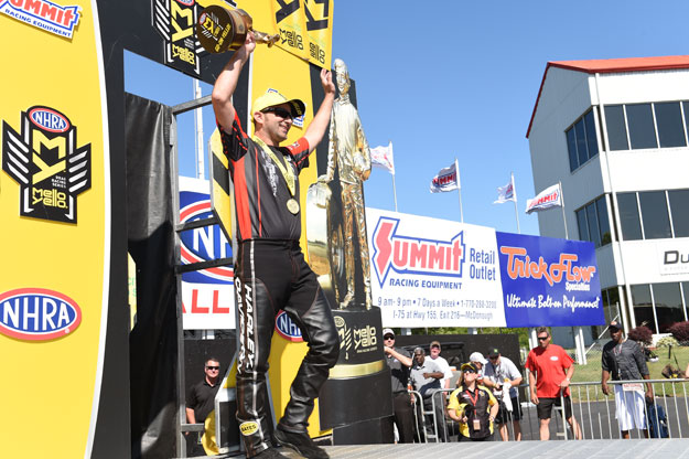 Not only do her 42 wins make Sampey the winningest female racer in NHRA history, but the tally also places her third on the Pro Stock Motorcycle wins list. Sampey broke through for her first victory in Reading in 1996, defeating Schultz in the final, and she steadily racked up race wins, not to mention three world championships, until she stepped away from racing following the 2008 season. Sampey returned to competition in late 2014, and in Englishtown, she made her return to the winner’s circle, outlasting Jerry Savoie for the Wally.