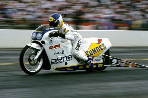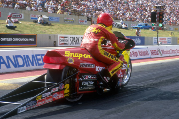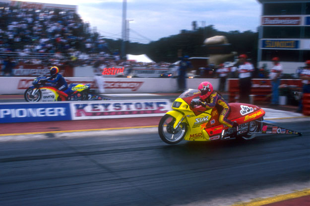 Much like class leader and on-track rival Schultz, there’s no telling how many more races Myers would have won because his career was cut short by a highway accident that claimed his life in 1998. Until that tragic accident, Myers was one of Pro Stock Motorcycle’s leaders, winning 33 times. Myers’ first win was a big one, coming in Indy in 1989, where he bested “Pizza John” Mafaro. Myers’ final victory also came in Indy, in 1997 against Matt Hines.