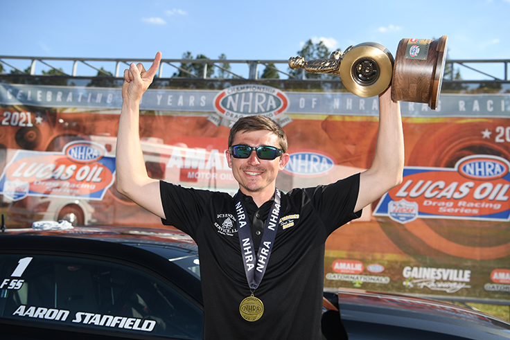 Following a season where he won five of six events and practically coasted to his first title in the Constant Aviation NHRA Factory Stock Showdown, Aaron Stanfield knew that winning a second title would be difficult, but he might not have anticipated the battle that ensued in 2021.