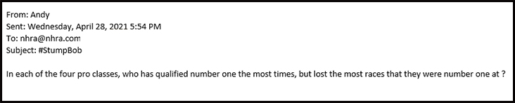 (Questions should be stats-based. No questions like "Who was the first to run 300 mph?" or "Which racer is nicknamed "Big Daddy"?)