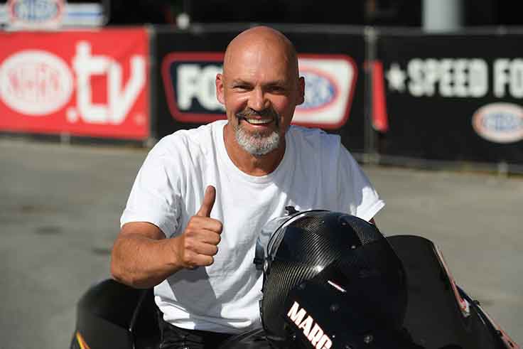 Admit it, unless you follow the Pro Stock Motorcycle class closely, you’ve probably never heard of Marc Ingwersen, but he’s worth a look since he nearly made the final round in Bristol, and it wasn’t by accident. Ingwersen was well ahead of Angelle Sampey in the semifinals when he suffered a mechanical problem and slowed. He likely would have given Jerry Savoie a fair fight had he gotten to to the final