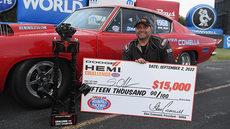 As he accepted the trophy and check, Comella was greeted warmly by the big crowd at Indy that has developed a deep appreciation for the Dodge Hemi Challenge program.