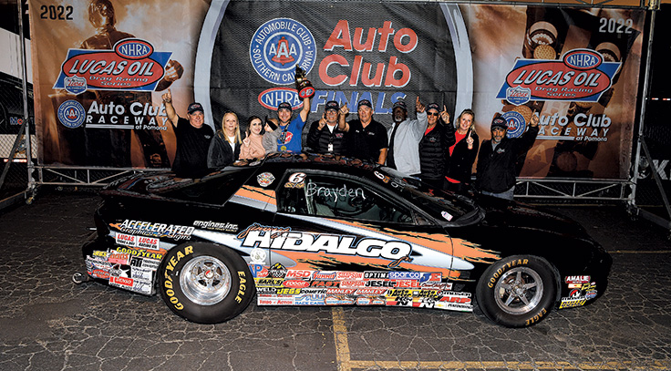 Hidalgo thanked his family; Stan and Sheila Holt and Jarrod with Lupe Tortilla; Lloyd and Linda Wofford and James Caro with Engines, Inc.; Brad and VP Racing Fuels; Kip Rhoton and K&N; Goodyear (with special thanks to Mart); John Partridge and Bullet Racing Cams; FAST Fuel Injection; FastShocks; Accelerated Graphics; Don Pellicino; Felix Acosta; Georgie Acosta; Michael Bryant; his parents, Jimmy and Denise; his girlfriend Hannah and children Brayden and Josie; and, finally, Pat Joffrion for helping with his first runs down the racetrack at No Problem Raceway.