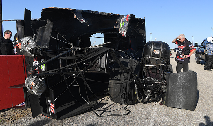 The scary incident began when Creasy’s TekPak entry lost traction a few hundred feet into the run, then suddenly darted into the right lane and into the path of Richards’ Verstran Mustang, which then collided with the right rear of Creasy’s machine.