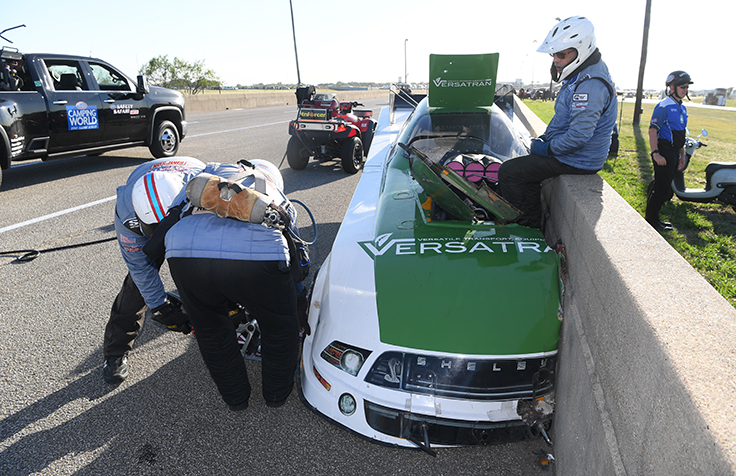 During the first round of qualifying of the Texas NHRA FallNationals at Texas Motorplex, Dale Creasy Jr.’s Funny Car crossed the centerline and made contact with Dave Richards’ vehicle, resulting in Richards hitting the wall. Both drivers exited their cars under their own power.
