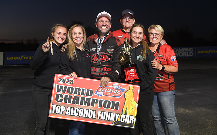 The second-generation cabinet maker from Paso Robles, Calif., will retire from driving with the cupboards full of trophies and accolades after winning his second straight and third Top Alcohol Funny Car championship in the last four years. Gordon is following through on his pledge to happily hang up his driving gloves and turn over the wheel of the family race car to his daughter, Maddi, in 2024, just as he took over from his father more than 20 years ago.