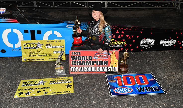 After Meyer’s daughters retired from the sport, 2022 was Nataas’ breakout season with two wins, including the prestigious Dodge Power Brokers NHRA U.S. Nationals, where she also won the JEGS Allstars race, but the best was still to come this year as the talented 26-year-old phenom blazed a trail to her first world championship on the strength of national and regional wins in her Oslo Tapet & Gulvelegg-backed dragster.