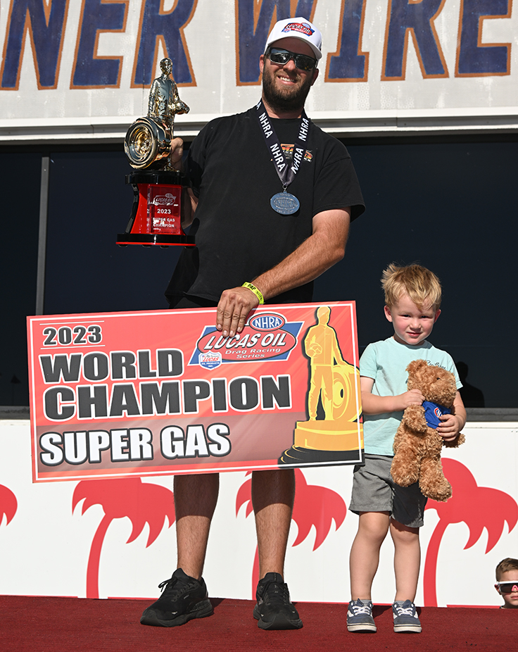 Trevor Larson celebrated his first NHRA Lucas Oil Drag Racing Series world title on stage in Pomona with young son Slade.