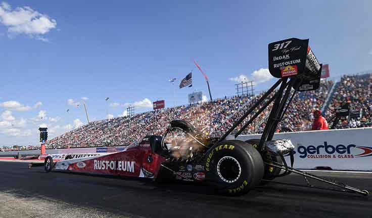 Top Fuel’s T.J. Zizzo enjoyed an incredible moment on Saturday, clinching his first career No. 1 qualifier as Friday’s standout pass of 3.735 at 331.77 in his 11,000-horsepower Rust-Oleum dragster easily held up. To accomplish that in front of a huge group of family and friends at his home track meant even more for the Chicago native, and he performed well in the heat on Saturday, making a pair of solid runs. That bodes well for Sunday’s eliminations, which starts against Tony Stewart as Zizzo seeks his first career victory.