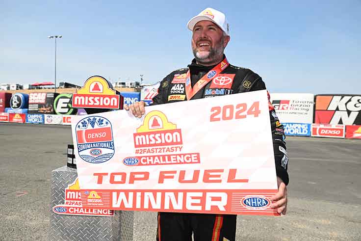 In a wild Top Fuel final round in the bonus race, Shawn Langdon defeated his Kalitta Motorsports teammate, reigning world champion Doug Kalitta, to win his first Mission #2Fast2Tasty Challenge of the 2024 campaign. Langdon went 4.660 at 160.94 in his 11,000-horsepower Kalitta Air Careers/Toyota dragster, defeating Kalitta’s 7.028 at 113.52 as both cars ran into trouble. Kalitta suffered tire smoke almost immediately and Langdon coasted to the win.