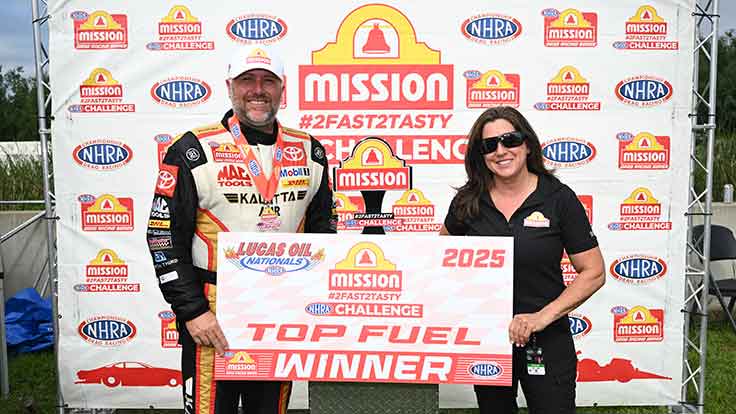 Despite the struggles in the final round of the Mission #2Fast2Tasty Challenge, Kalitta did claim his seventh No. 1 qualifier of the season in his Mac Tools dragster on Saturday’s earlier run of 3.655 at 339.36. It’s the 65th career No. 1 qualifier for the former world champ who opens eliminations against Terry Totten, attempting to pick up his second straight victory in 2025.