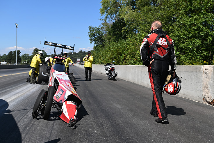 The team’s moxie was tested at the Reading event, where, after taking a first-round win over Tony Stewart, Kalitta’s mount suffered an apparent front-tire issue just past the finish line. His car swerved across the centerline and collided with Stewart’s entry.