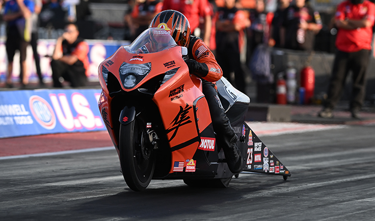 Richard Gadson got the best of Matt Smith in the final round of the Mission #2Fast2Tasty Challenge in Pro Stock Motorcycle, going an impressive 6.744 at 201.01 on his RevZilla/Motul/Vance & Hines Suzuki.