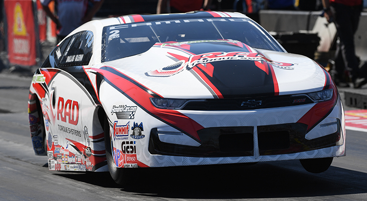 Points leader Dallas Glenn breathed a sigh of relief as he was able to drive past Cody Coughlin’s holeshot to win by just .008-second to keep his lead intact. Glenn’s RAD Torque Systems Camaro has been almost unerring in getting down the track, making full pulls on 107 of 115 runs this season.