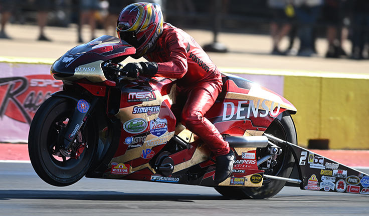 Anglie Smith and teammate John Hall moved on with respective 6.80 and 6.81 wins over Chris Bostick and Kelly Clontz. Their leader, Matt Smith, also advanced, beating fellow MSR rider Jianna Evaristo for the sixth straight time this season, then rode out some scary top-end wobbles as did Ryan Oehler.after losing to Brayden Davis.